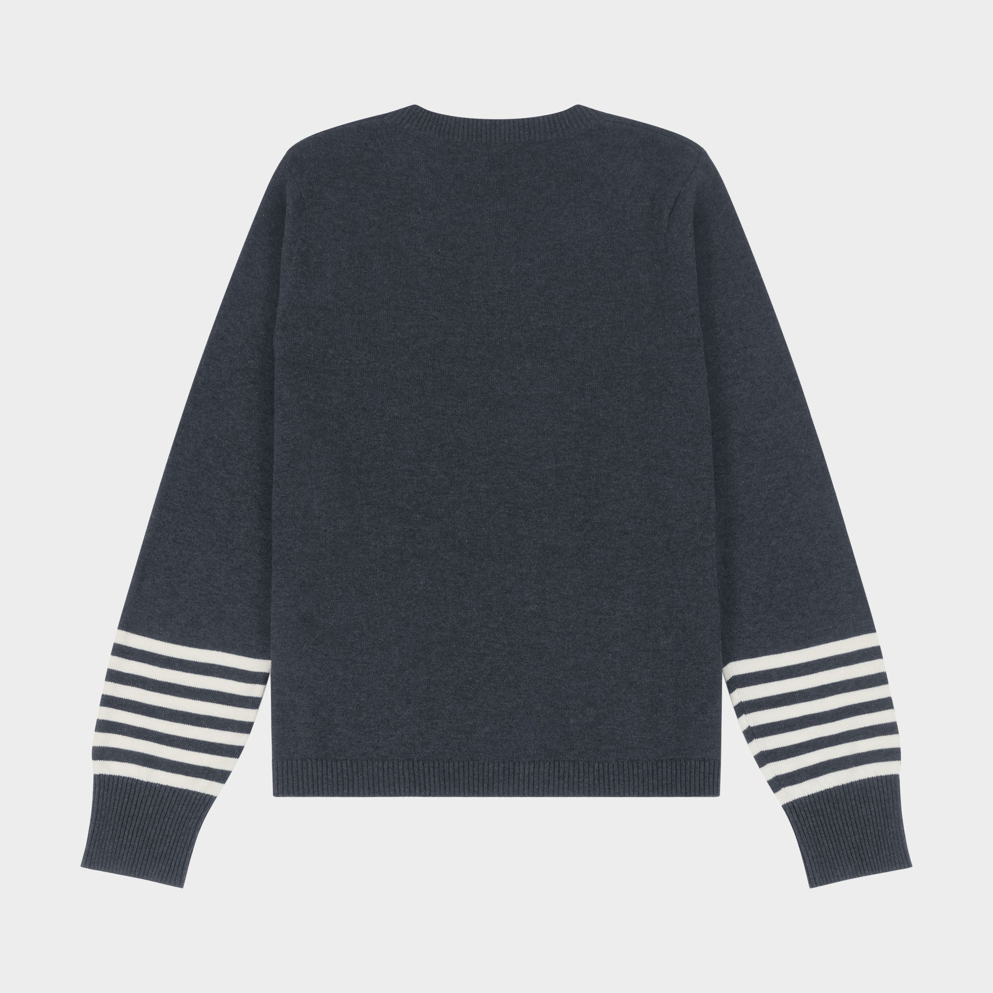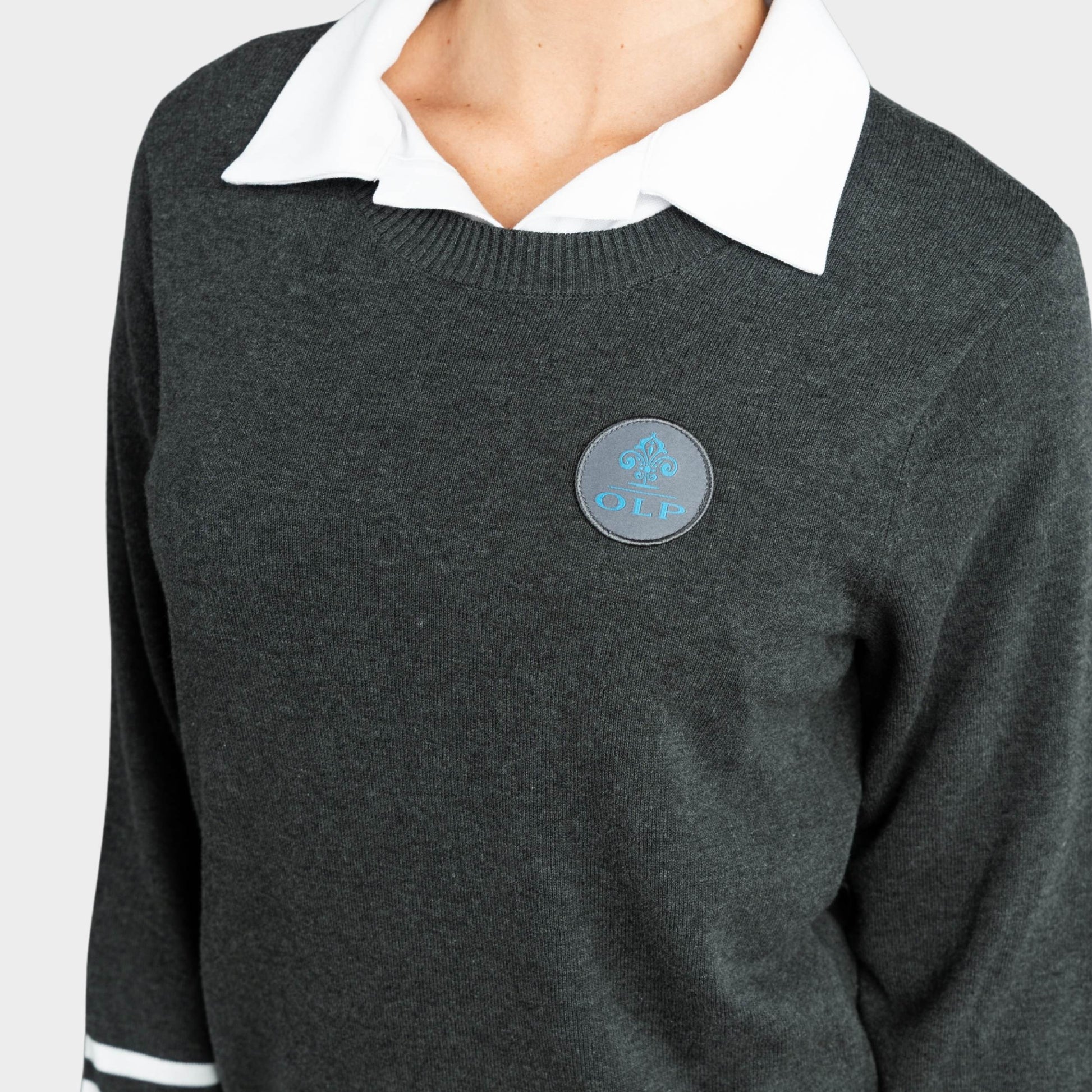 A classic layering piece designed for everyday uniform wear. This crew neck pullover is made from 100% cotton and features contrast stripes around the sleeves for a sharp, elevated detail. It includes a school logo patch on the chest and is the perfect layering weight—light enough to wear over a polo and easy to layer under a blazer or jacket. The fit is flattering on all body types and can be sized up for a relaxed look or down for a more fitted silhouette. Made from natural cotton fibers that may show slight variation in color and will soften with every wash.