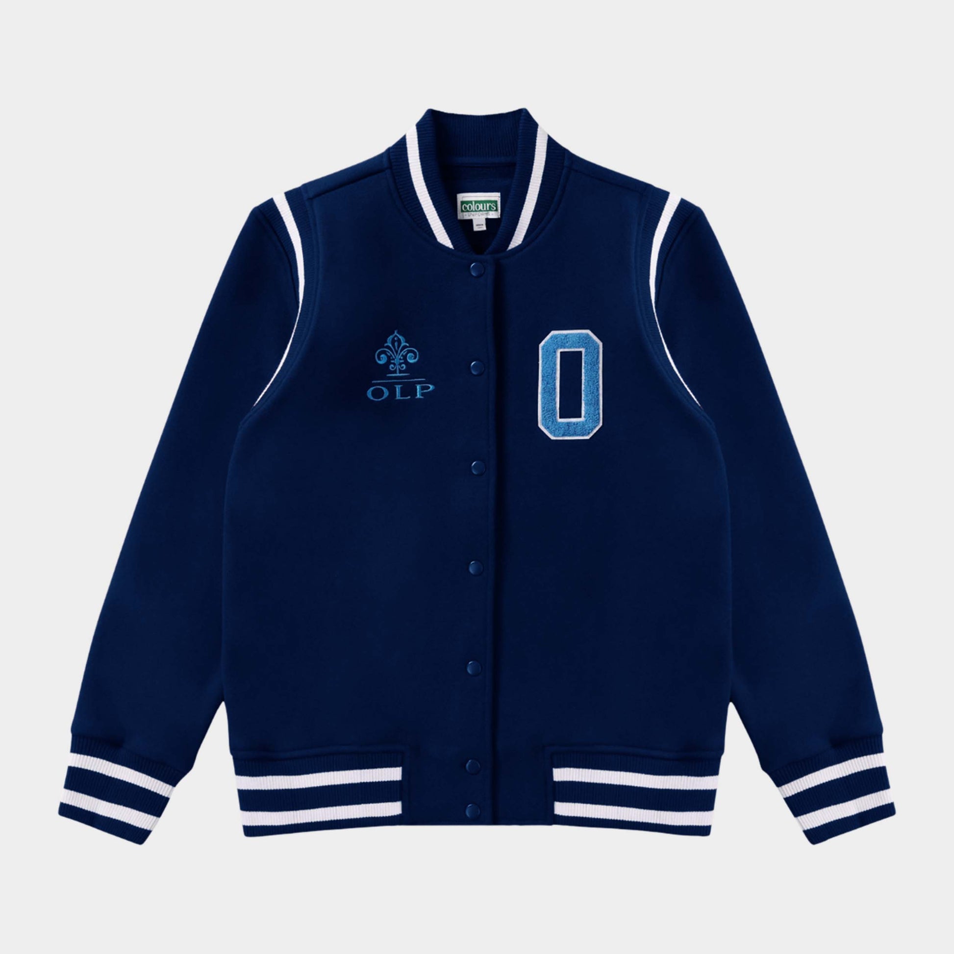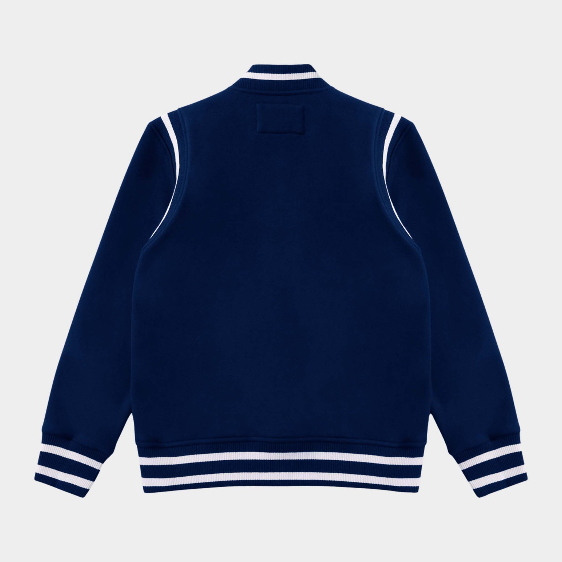A throwback favorite with a comfort-first twist. The Fleece Varsity Jacket is made from heavyweight fleece that feels like your coziest sweatshirt but looks like a classic letterman. It features a snap-front closure, mesh-lined pockets, and contrast striped ribbing at the collar, cuffs, and hem. A bold chenille patch with your school letter and embroidered school logo gives it that timeless varsity look—designed to keep you warm, comfortable, and school-ready.