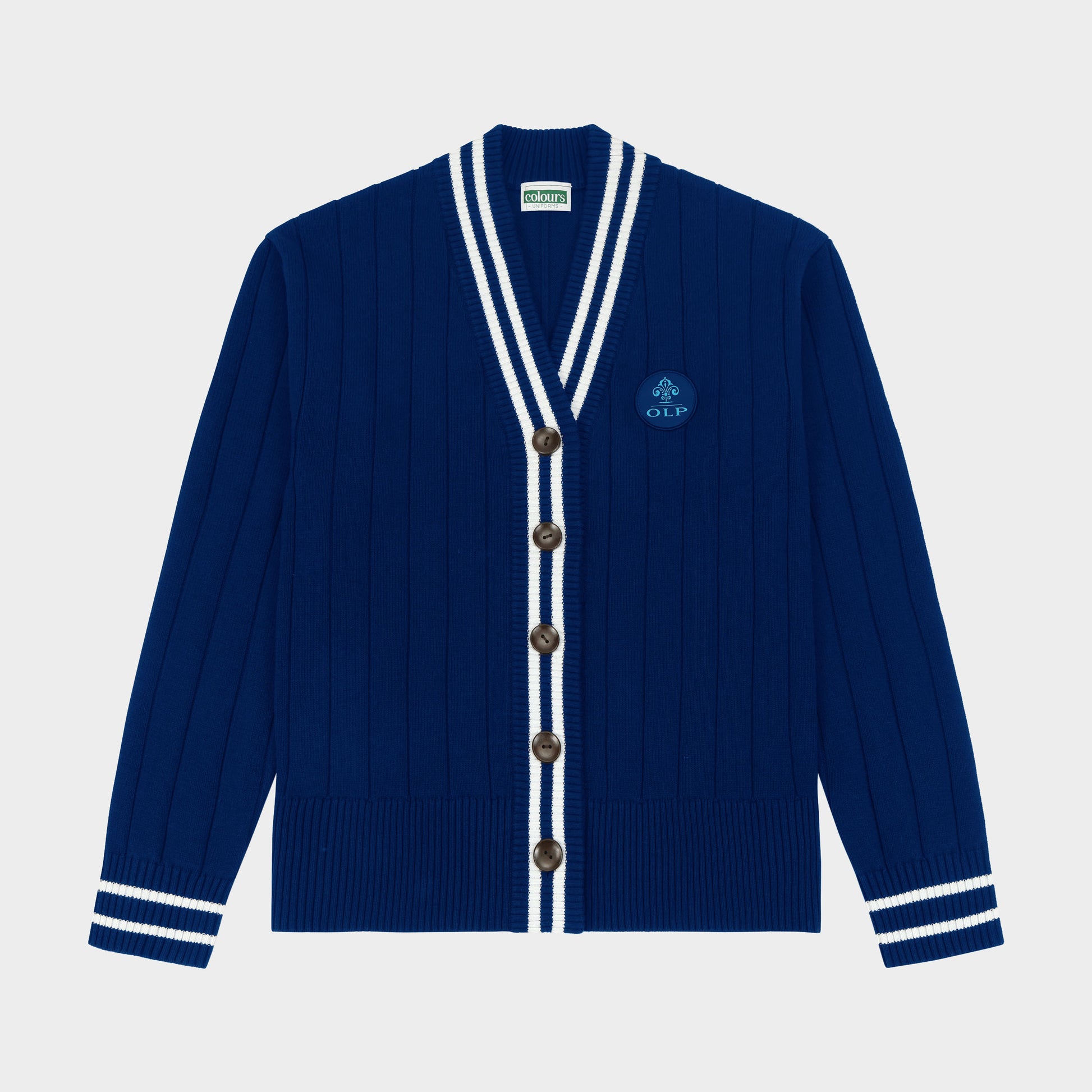 An updated take on a timeless school style. The Letterman V-Neck Cardigan features classic contrasting striped ribbing along the placket, collar, and cuffs for a fresh, tailored look. Made from 100% cotton, this style is soft, breathable, and naturally rich in character—expect slight color variations and a fabric that softens beautifully with every wash. Finished with your school logo patch on the left chest.