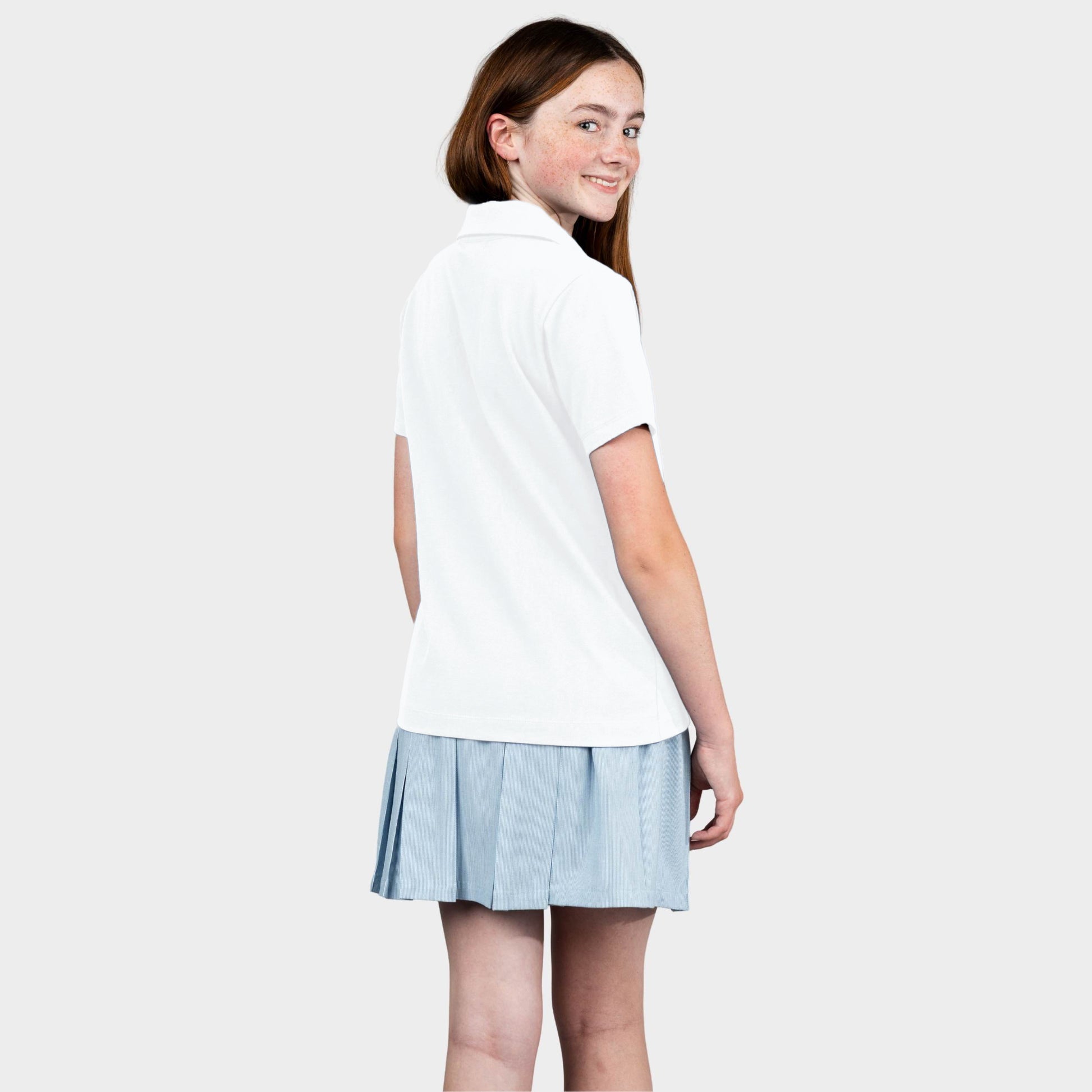An iconic pleated skirt, made in light blue pin feather stripe. This updated take on the classic pleated skirt features a fully elasticized waistband with an interior drawstring for all-day comfort and an adjustable fit. It also includes an ultra-soft, attached lining for added ease and coverage—perfect for school days on the move.