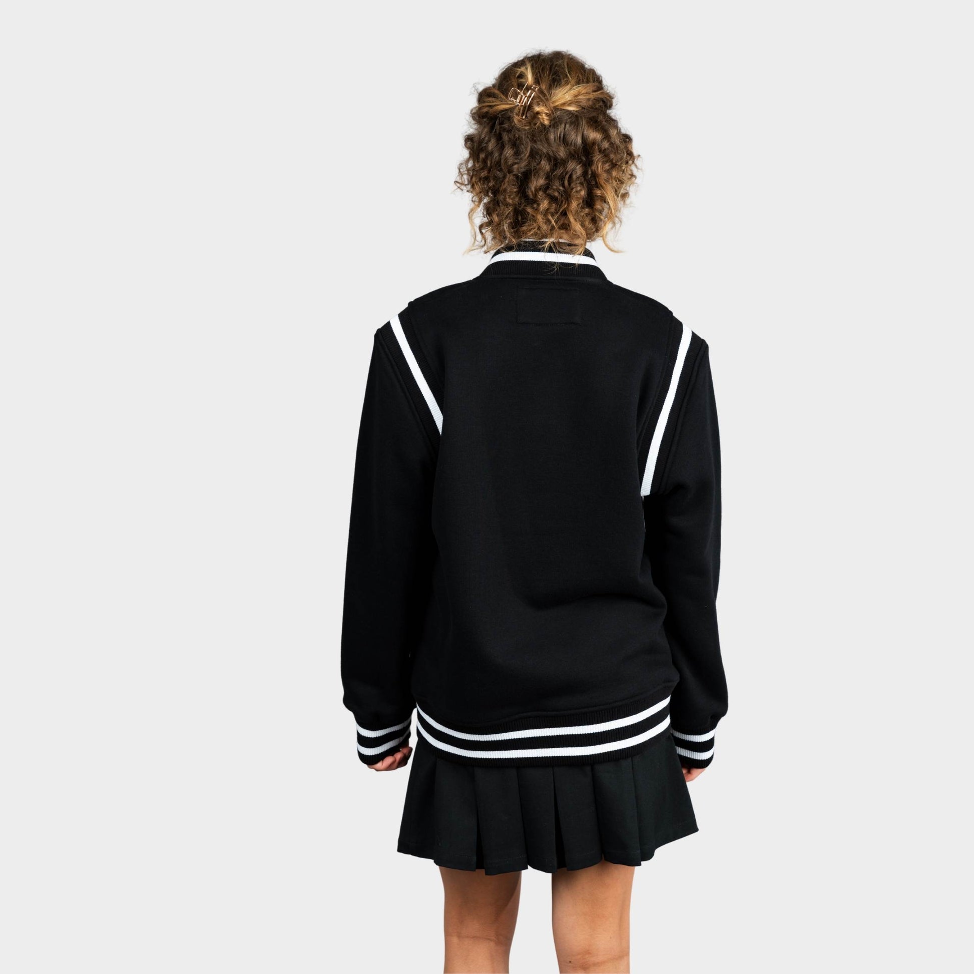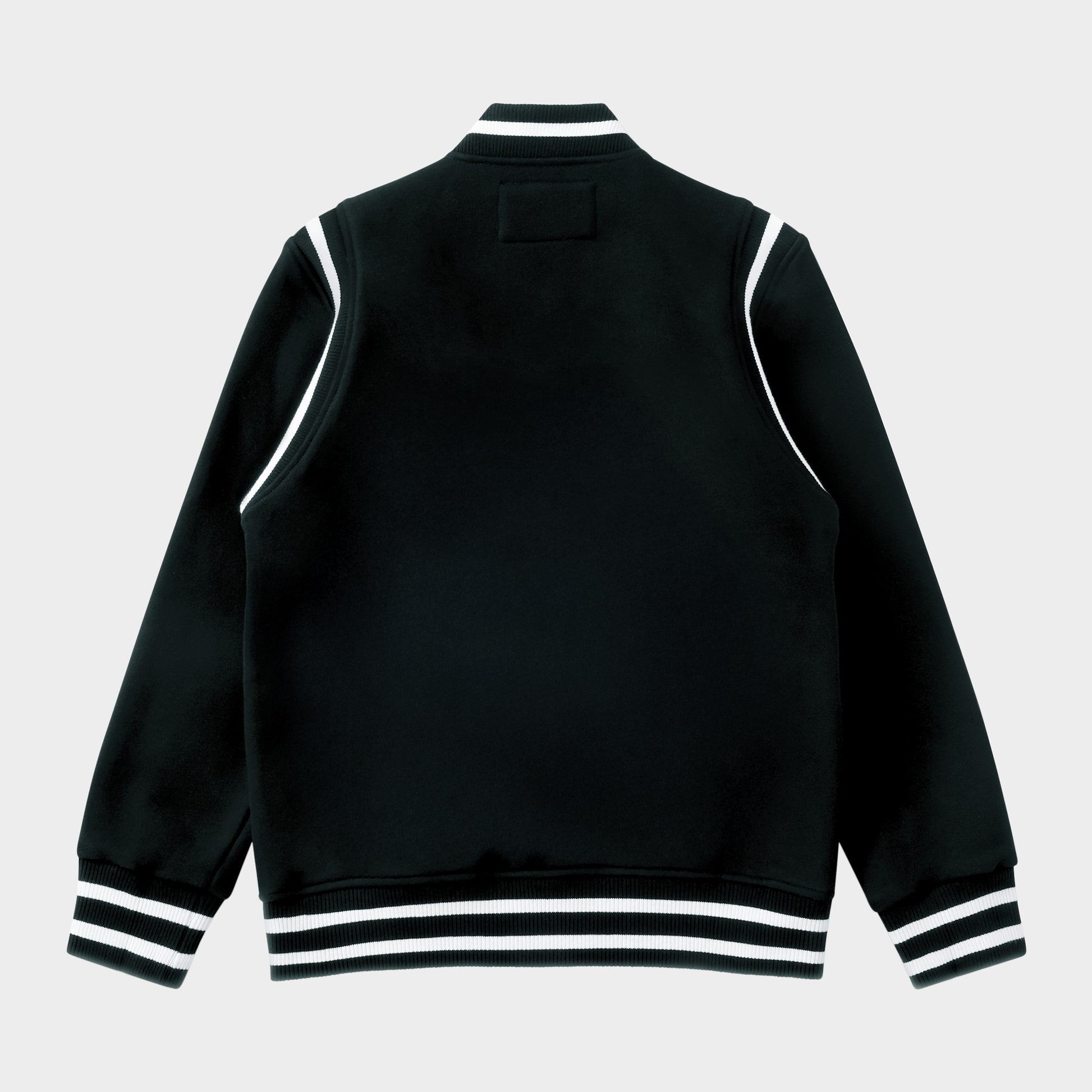 A throwback favorite with a comfort-first twist. The Fleece Varsity Jacket is made from heavyweight fleece that feels like your coziest sweatshirt but looks like a classic letterman. It features a snap-front closure, mesh-lined pockets, and contrast striped ribbing at the collar, cuffs, and hem. A bold chenille patch with your school letter and embroidered school logo gives it that timeless varsity look—designed to keep you warm, comfortable, and school-ready.